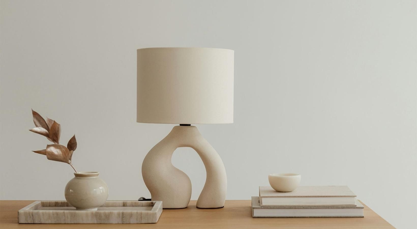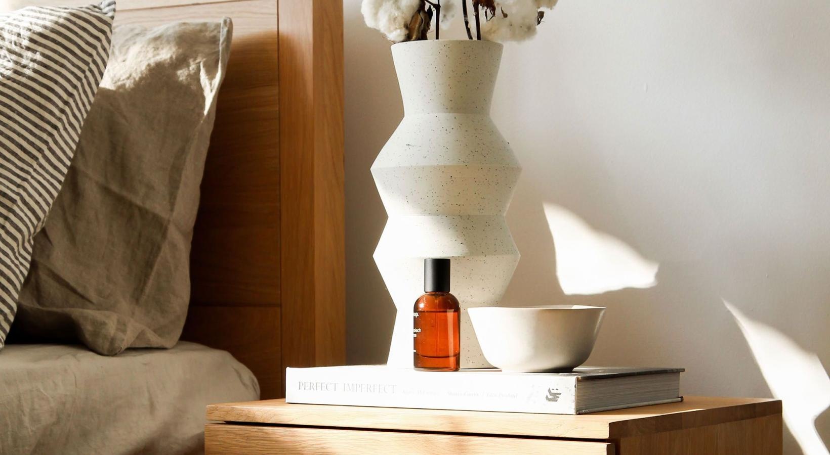 • living room with a throw on a couch beside a large floor vase with a plant in it